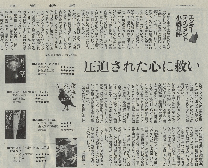 エンターテイメント小説月報/「読売新聞」 最高得点をいただきました