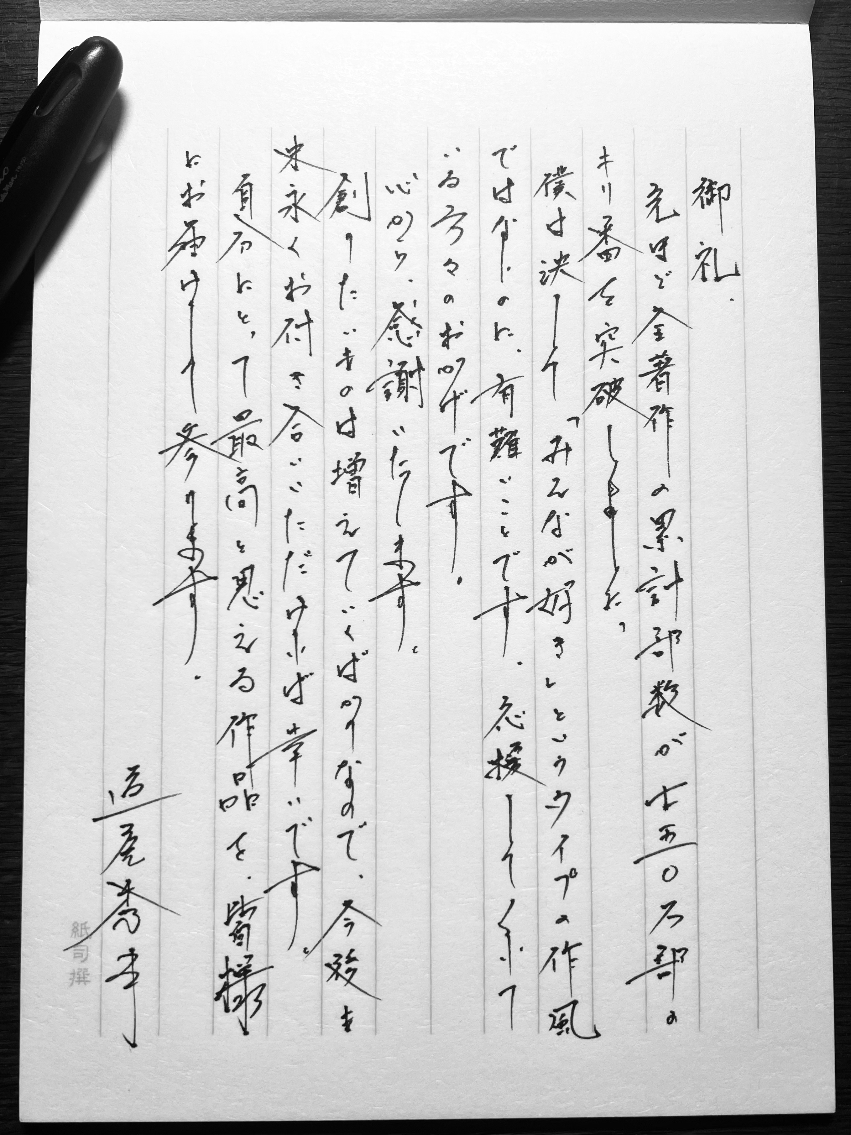 道尾秀介です。 いつも著書をお読みいただき、また販売していただき、ありがとうございます。 このたび作品の累計部数が750万部を超えました。 書きたいものしか書いてこなかったのに、皆様にお付き合いいただき、心から感謝しています。 今後とも著書をよろしくお願いいたします。
